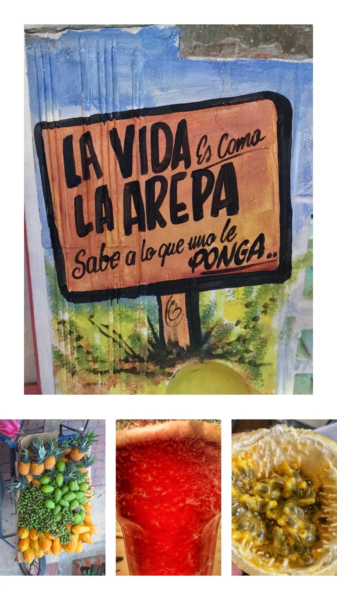Une des spécialités du pays (et du Venezuela) s’appelle « arepa » (pensez pain pita mais fait à base de maïs, farci avec ce que vous voulez). Le panneau sur ma photo pourrait se traduire « La vie, c’est comme une arepa, elle a le goût de ce que vous mettez dedans ! »