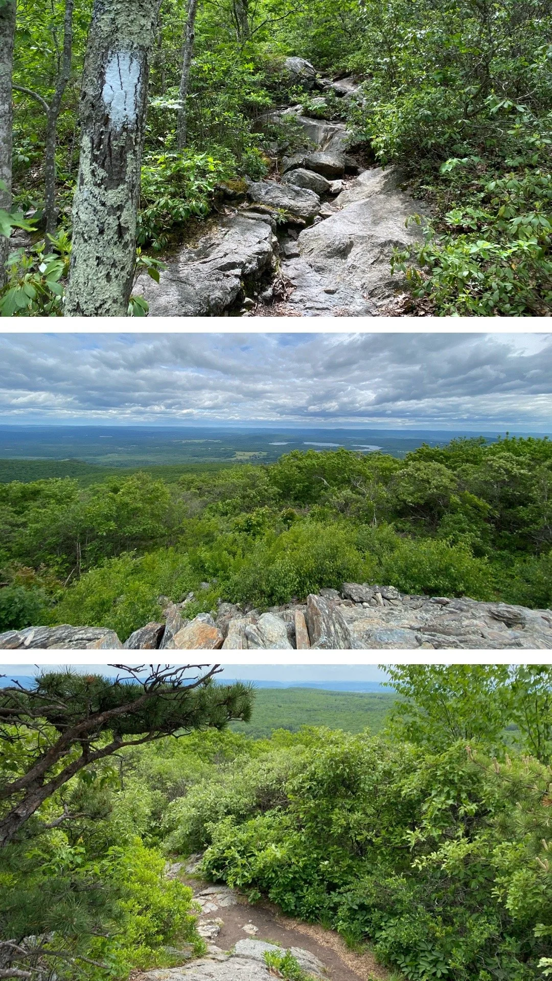 Right after the sign telling you you have reached bear Mountain, there is a mound on rocks you can climb on to get some more elevation and for a gorgeous view of the forest and some lakes below.
