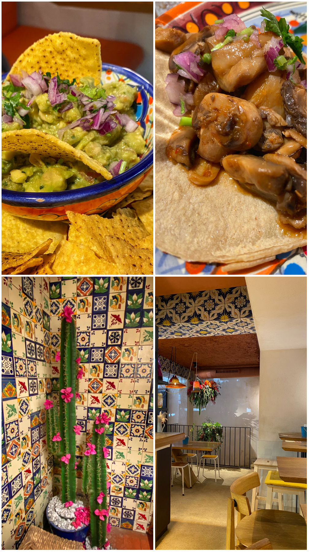 Take the opportunity to practice your Spanish with the servers at this Mexican restaurant! They have an excellent guacamole, and the agua de jamaica (hibiscus tea) is spot-on. There are two vegan options for tacos (the champiñones al ajillo is shown in the photo) and a vegan burrito. The menu uses symbols to indicate the vegetarian options, and which ones contain cheese.