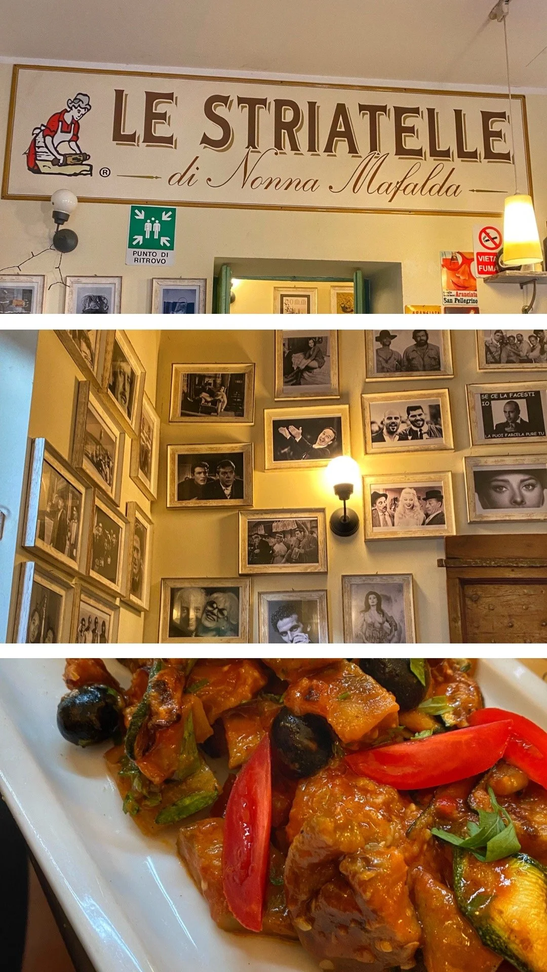 J’ai été très contente chez Le Striatelle di Nonna Mafalda, qui a une terrasse mais aussi de la place à l’intérieur, où les murs sont décorés de photos de stars du cinéma italien.