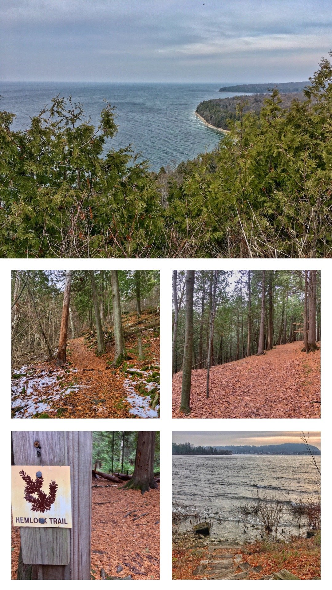 This Lollipop loop gives you a little bit of everything, with some climbs on the Hemlock Trail (and a nice view of the lake from Sven’s Bluff!), some level segments, and nice views of the lake from low on the Sunset Route.